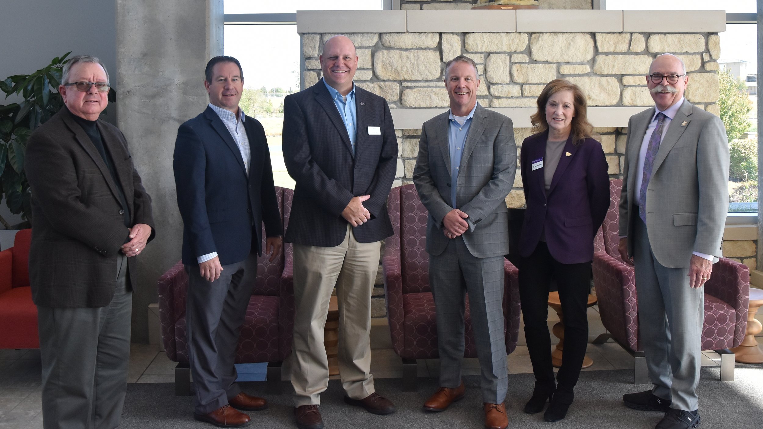 (Left to right) Bob Petersen, AgBizKC Executive Director, Dustin Johansen, AgBizKC Chair, Dr. Ben Wolfe, K-State Olathe, Ron Seeber, AgBizKC Vice Chair, Dr. Bonnie Rush, KSU-college of Veterinary Medicine, and Dr. Ernie Minton, KSU-College of Agriculture