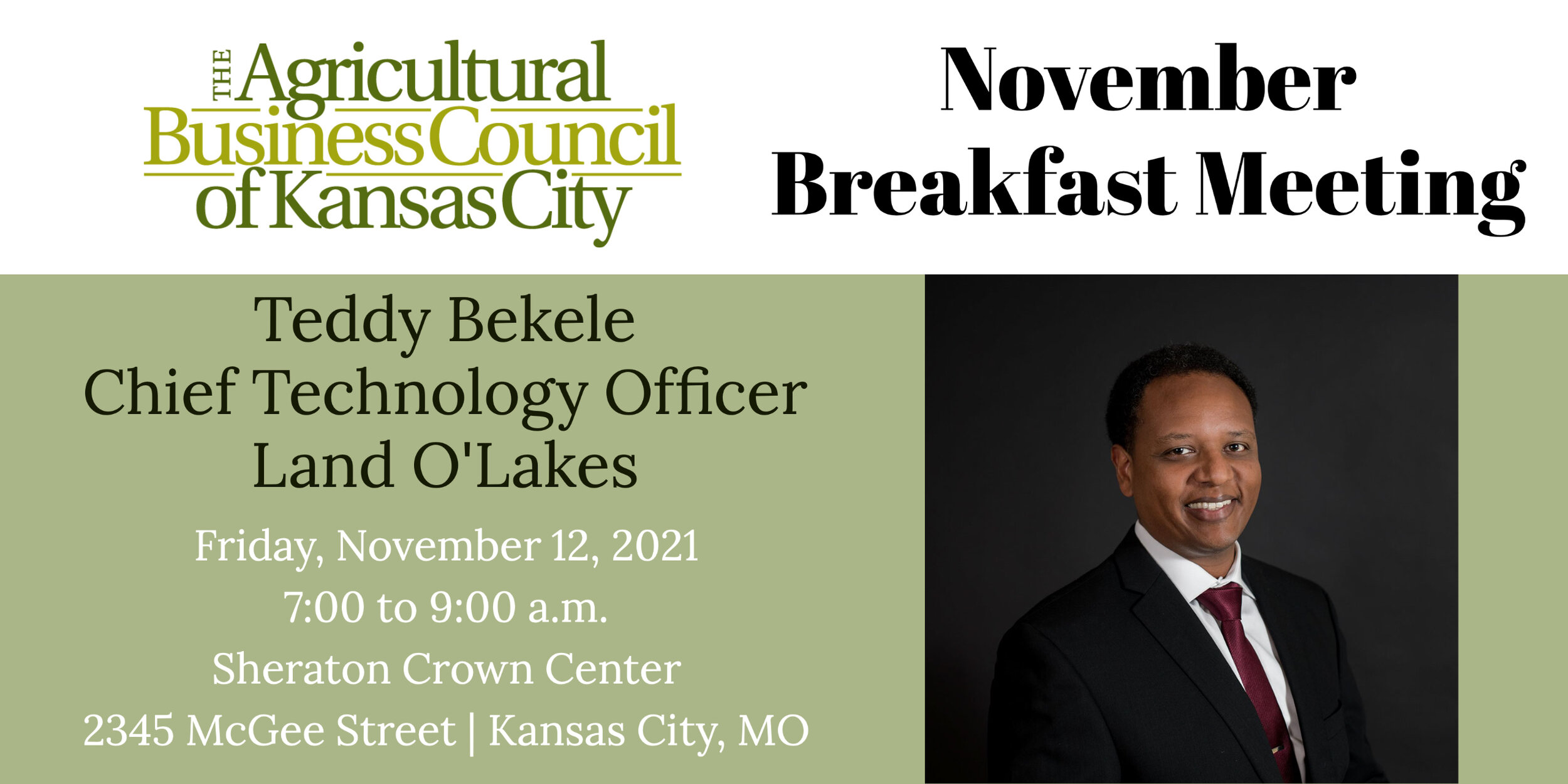 The Agricultural Business Council of Kansas City is pleased to again be holding the November monthly meeting in conjunction with the Agriculture Future of America's annual Leaders Conference at the Sheraton Crown Center. Join AFA Board members for breakfast featuring Teddy Bekele, Chief Technology Officer, Land O'Lakes.