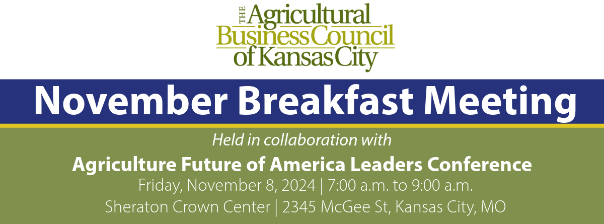 The Agricultural Business Council of Kansas City is pleased to again be holding the November monthly meeting in conjunction with the Agriculture Future of America's annual Leaders Conference at the Sheraton Crown Center. Join AFA Board members for breakfast featuring Elizabeth Fastiggi, Global Head, Agri-food at Amazon Web Services (AWS). Her remarks will focus on the intersection of agriculture and technology, especially artificial intelligence.