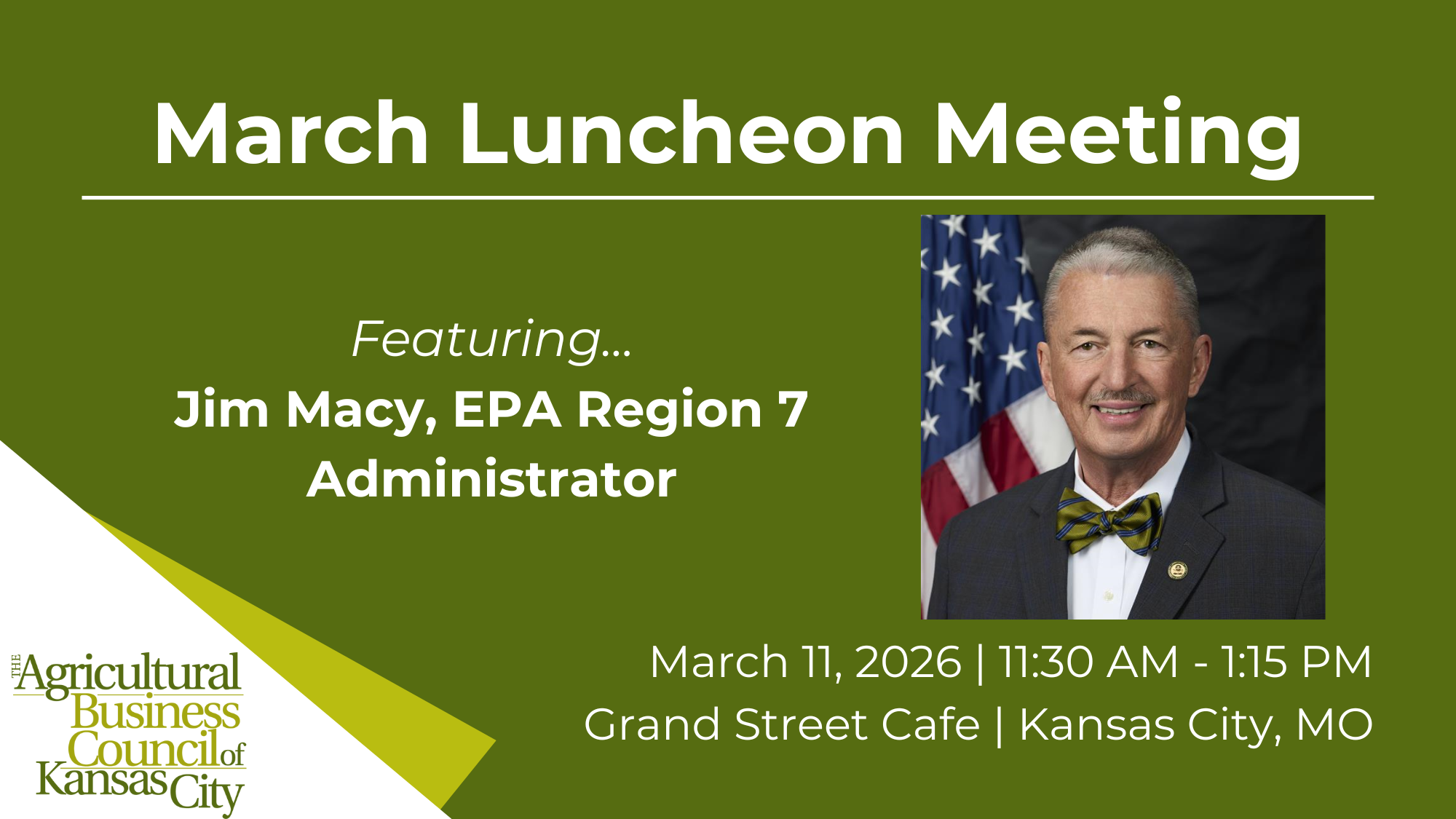 Join us for the Council’s March Luncheon Meeting at Grand Street Café. We are pleased to welcome Jim Macy, Regional Administrator for EPA Region 7, which serves Iowa, Kansas, Missouri, Nebraska, and nine tribal nations.